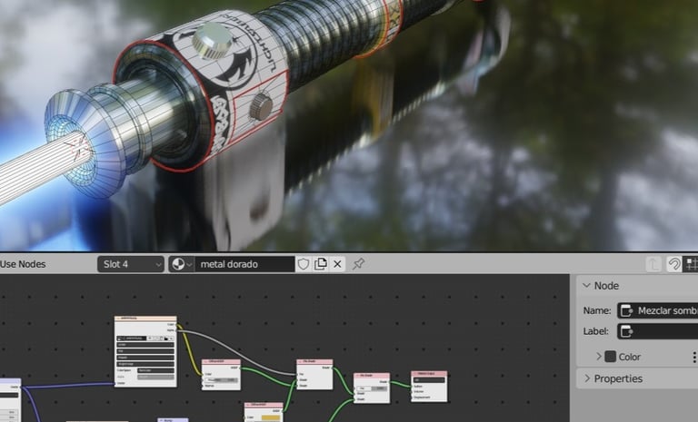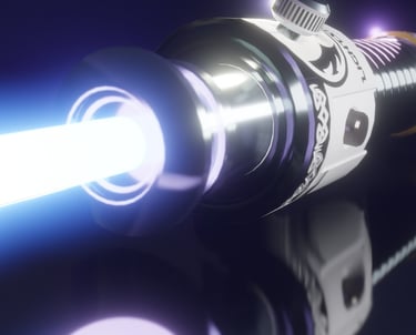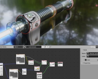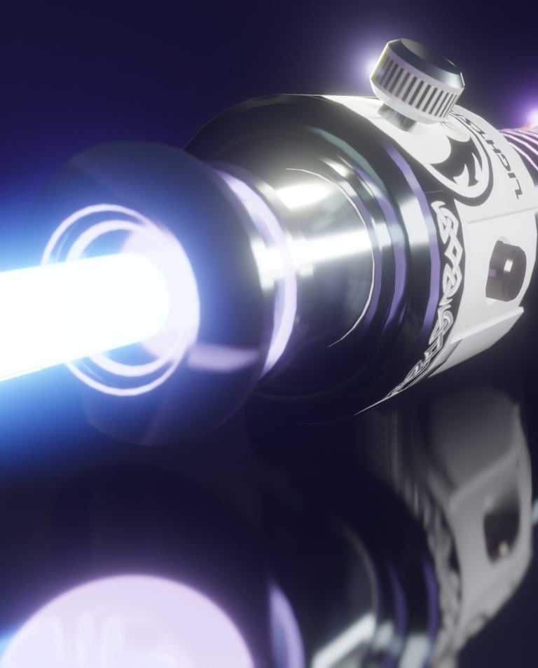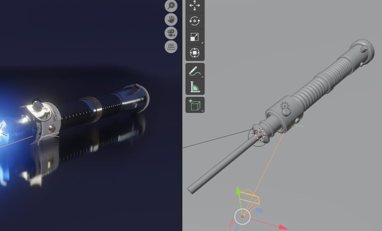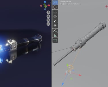 Sono state impiegate suddivisioni per affinare la geometria e nodi per materiali personalizzati, enfatizzando l'emissione di luce sulla lama. L'illuminazione e i riflessi sono stati ottimizzati nella scena per valorizzare l'estetica futuristica, rendendolo un ottimo esempio per un portfolio di design 3D.